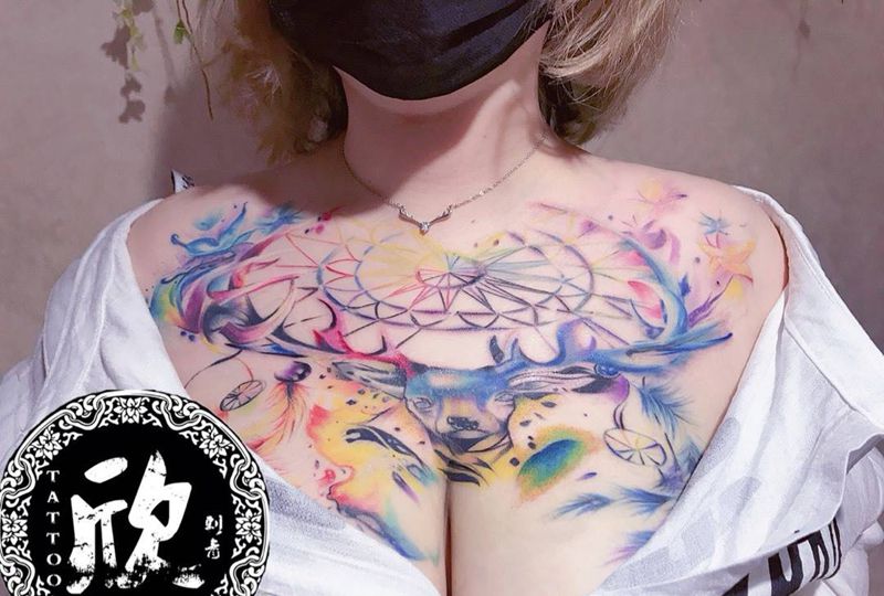 胸口彩色鹿纹身图片