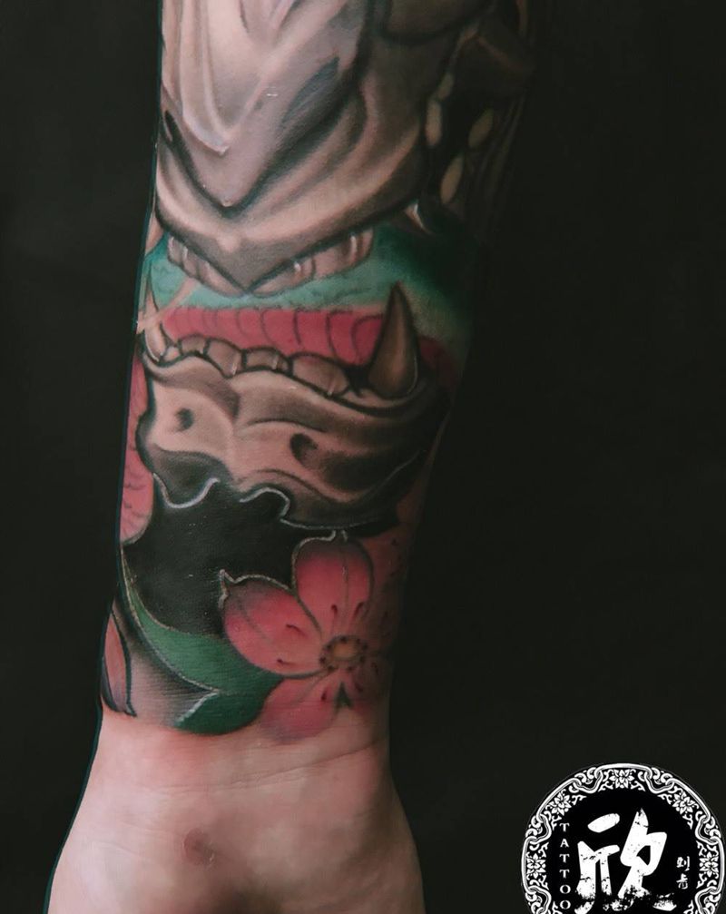小臂般若纹身图片_手臂新传统般若传统彩色纹身图案