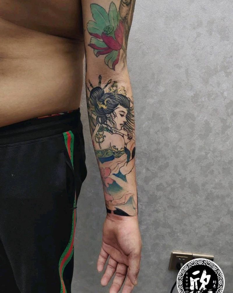 当前位置: 首页 >辽宁省丹东市纹身店-欣刺青纹身图案>艺伎纹身图片_手臂脚部老传统新传统艺伎小臂传统纹身图案