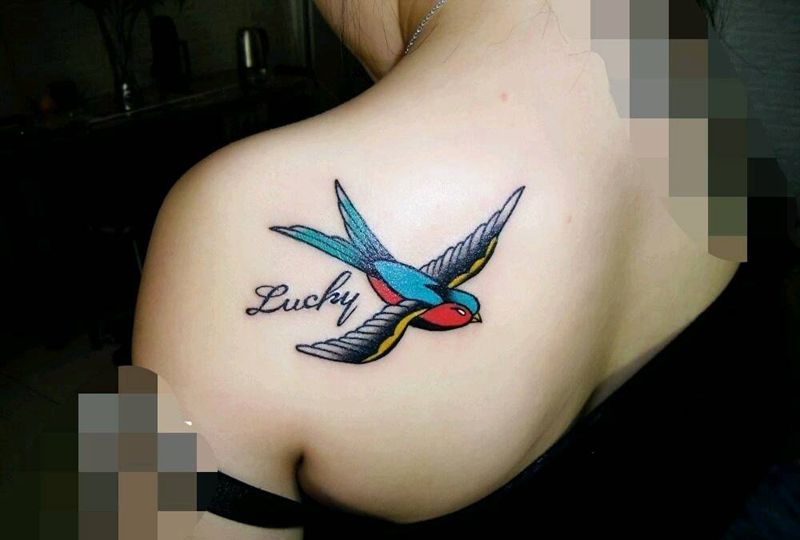 彩色燕子纹身图片_肩部背部New SchoolOld School女师鲅鱼圈悦染馆纹身图案