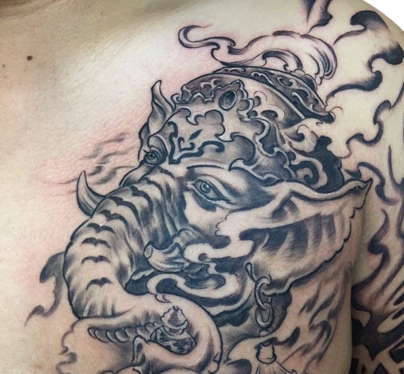 当前位置: 首页 >辽宁省营口市纹身店-80_MD_tattoo纹身图案>象神前胸纹身图片