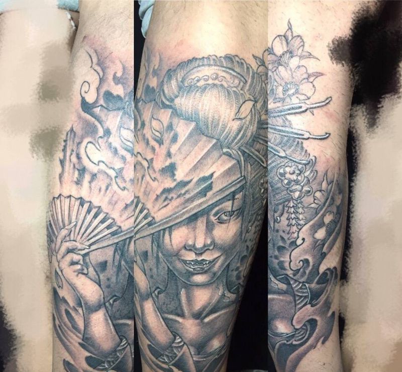 • T包小腿吹火男+阿多福纹身图片_腿部老传统新传统吹火男阿