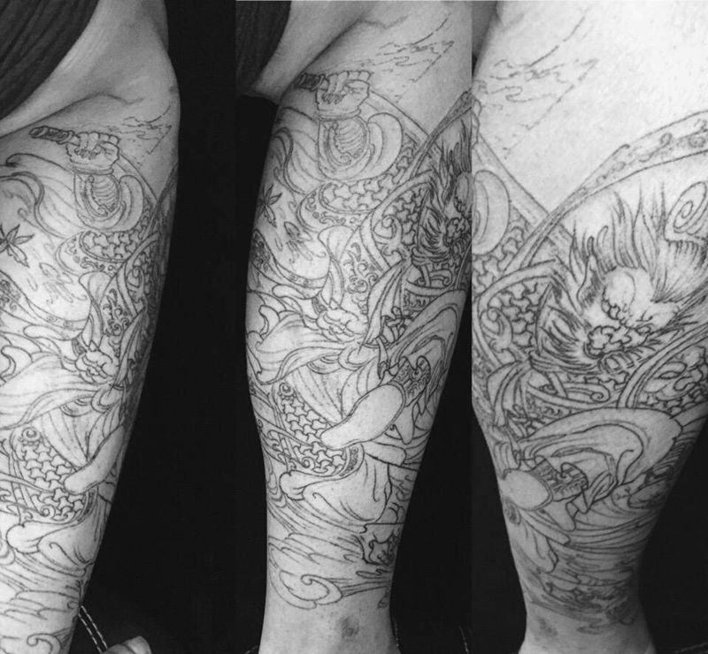 • T网红王老大花腿龙纹身图片_腿部新传统纹身图案