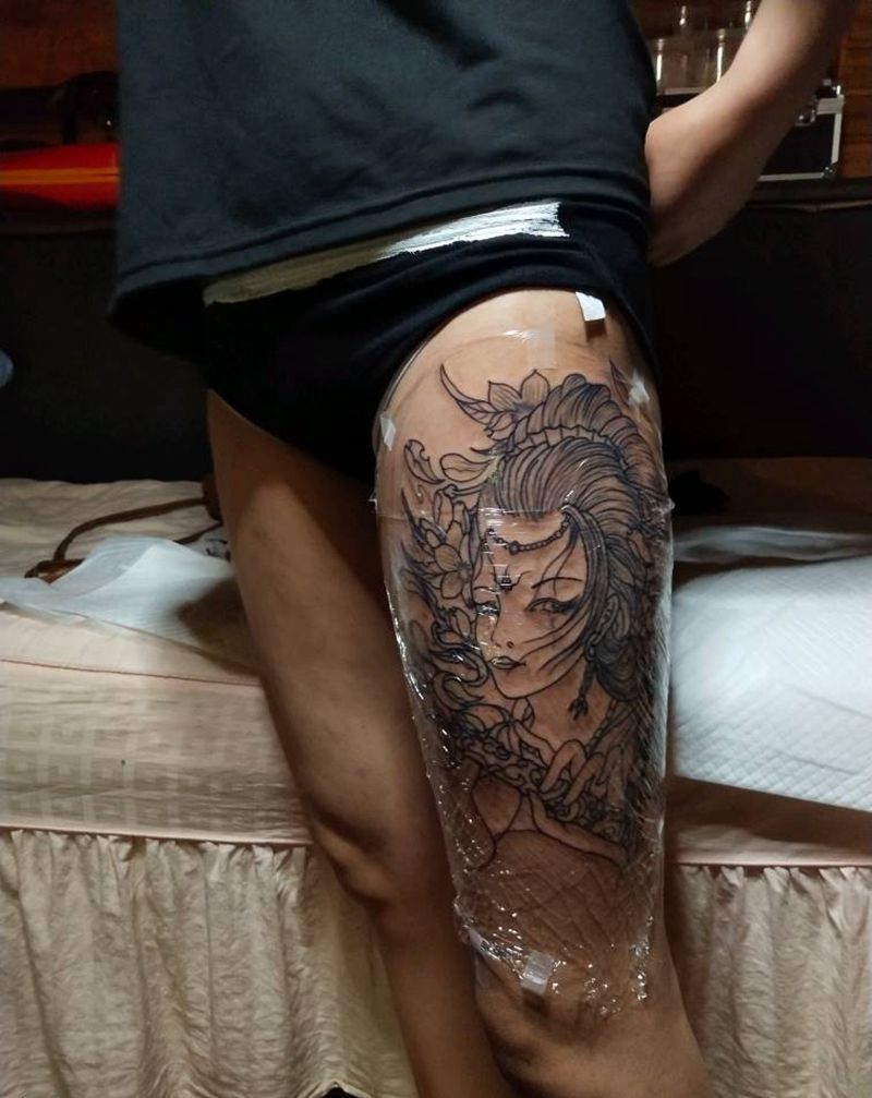 • T网红王老大花腿龙纹身图片_腿部新传统纹身图案