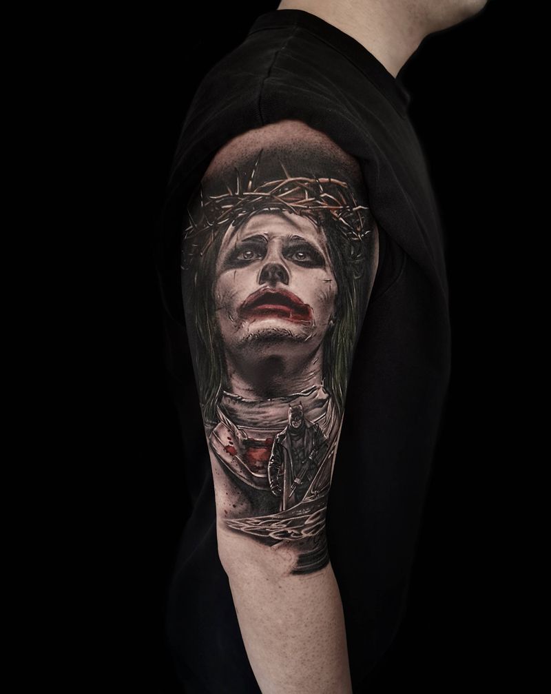 当前位置: 首页 >辽宁省营口市纹身店-曹宁刺青 纹身图案>小丑花臂未完待续纹身图片_手臂欧美写实纹身图案