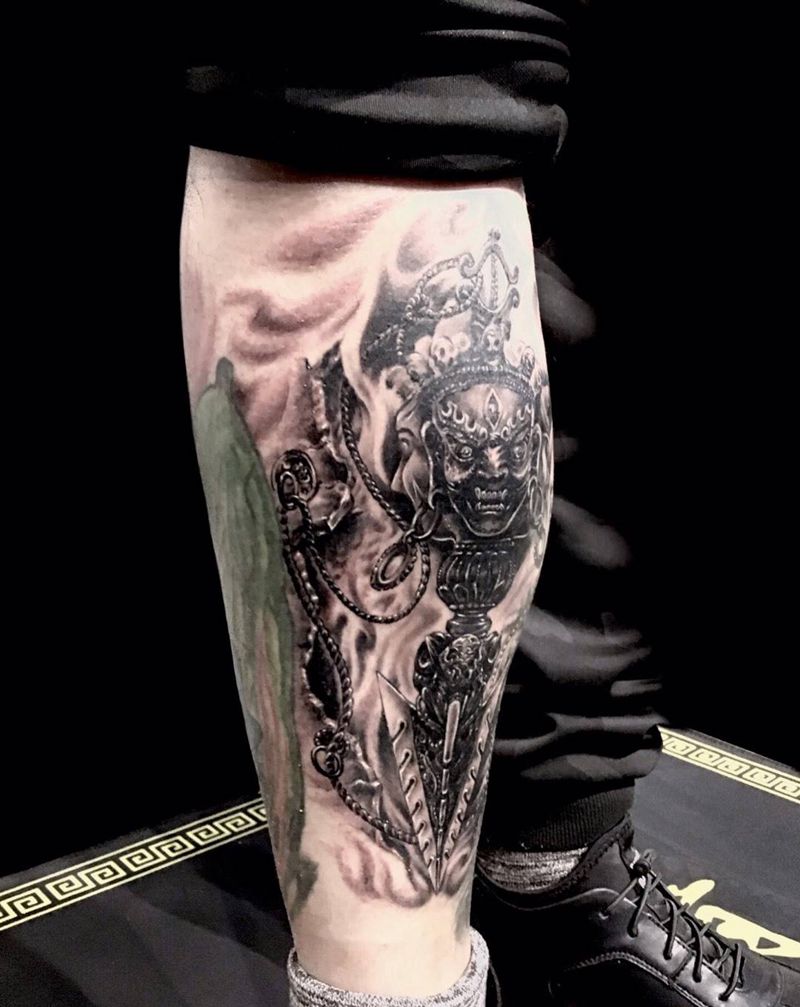降魔杵纹身图片_腿部欧美写实新传统纹身图案