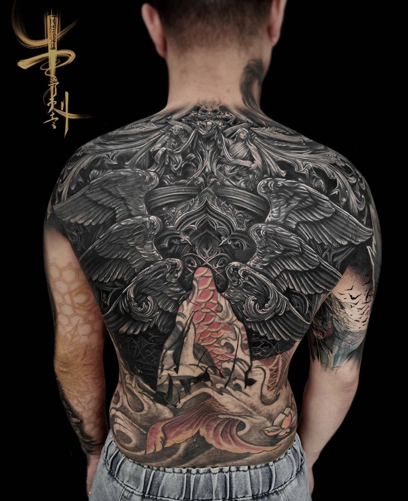 当前位置: 首页 >辽宁省营口市纹身店-曹宁刺青 纹身图案>满背遮盖纹身图片_背部欧美写实满背遮盖鱼纹身图案