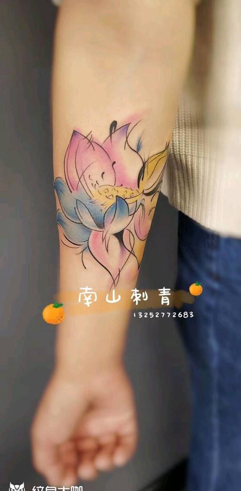 当前位置: 首页 >辽宁省朝阳市纹身店-南山刺青工作室纹身图案>水彩荷花纹身图片_手臂手部水彩水墨荷花纹身图案