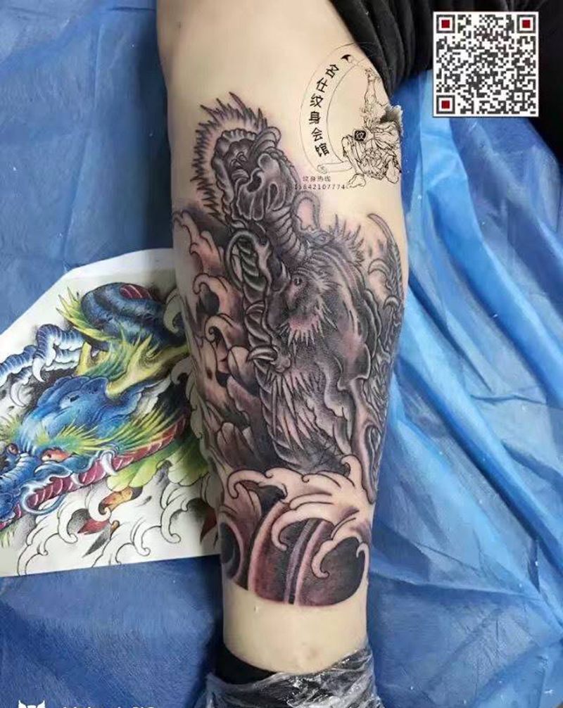 • T网红王老大花腿龙纹身图片_腿部新传统纹身图案