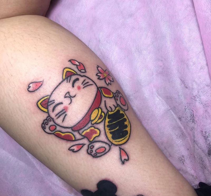 招财猫纹身图片_腿部纹身图案