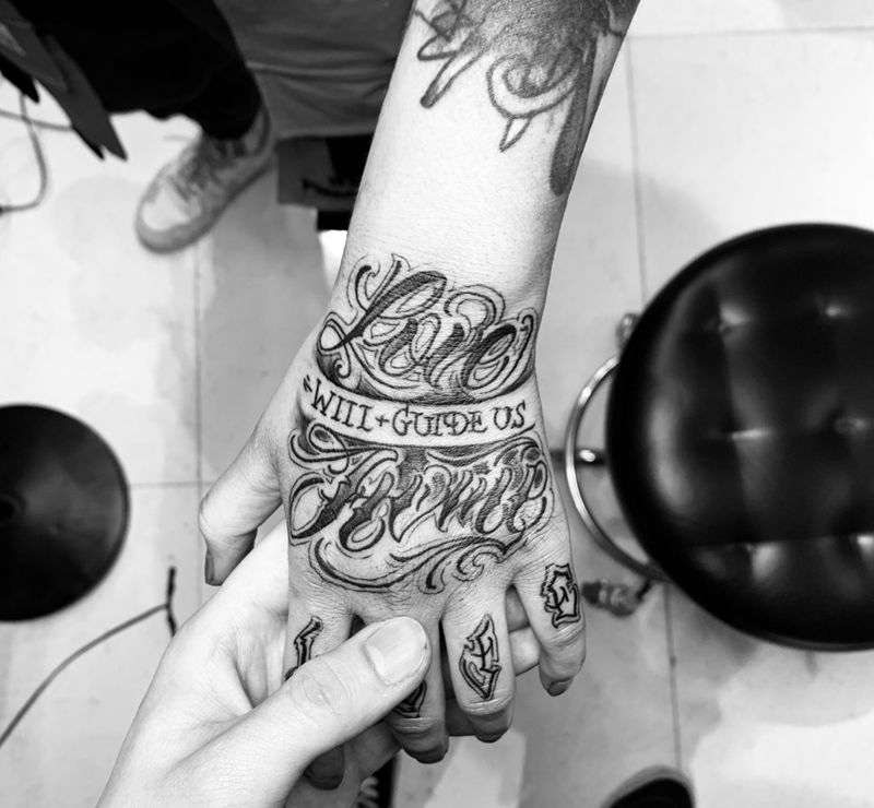 当前位置: 首页 >辽宁省葫芦岛市纹身店-2347工作室大国刺青纹身图案>爱指引我们回家(手面)人生(手指)纹身图片