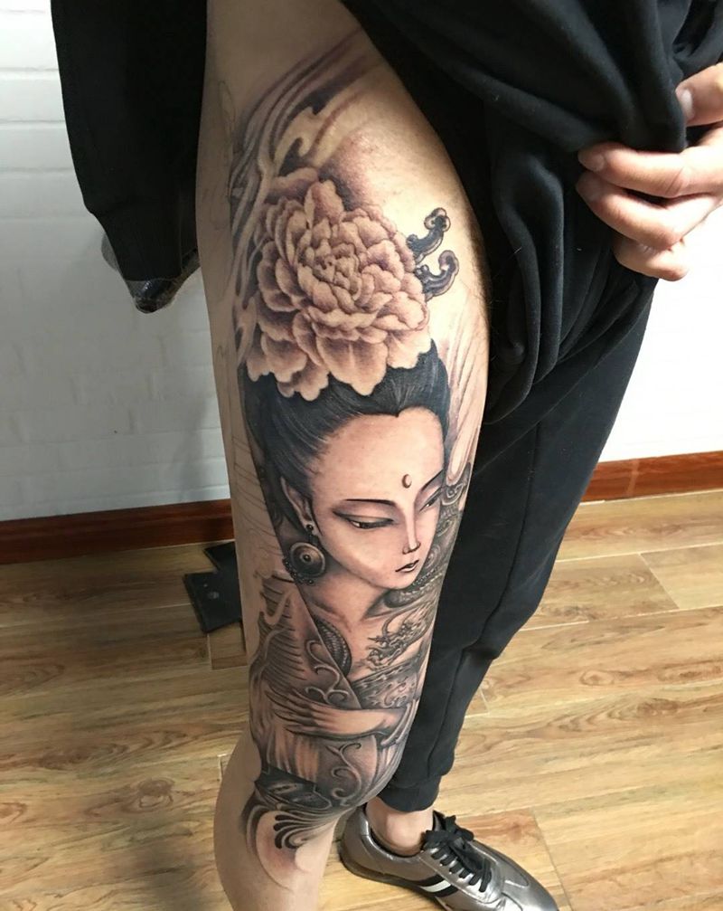 当前位置: 首页 >辽宁省葫芦岛市纹身店-艾加纹身工作室纹身图案>花腿纹身古风美女纹身图片_成品腿部传统肖像写实人物纹身图案