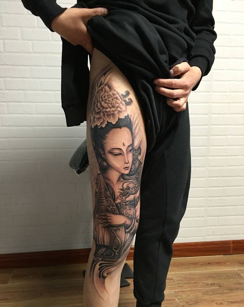 当前位置: 首页 >辽宁省葫芦岛市纹身店-艾加纹身工作室纹身图案>花腿纹身古风美女纹身图片_成品腿部传统肖像写实人物纹身图案