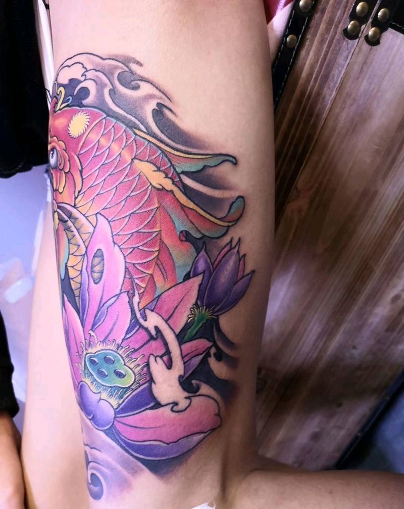 彩色鲤鱼纹身图片_腿部新传统纹身图案