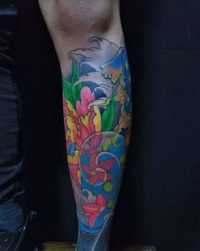• T网红王老大花腿龙纹身图片_腿部新传统纹身图案