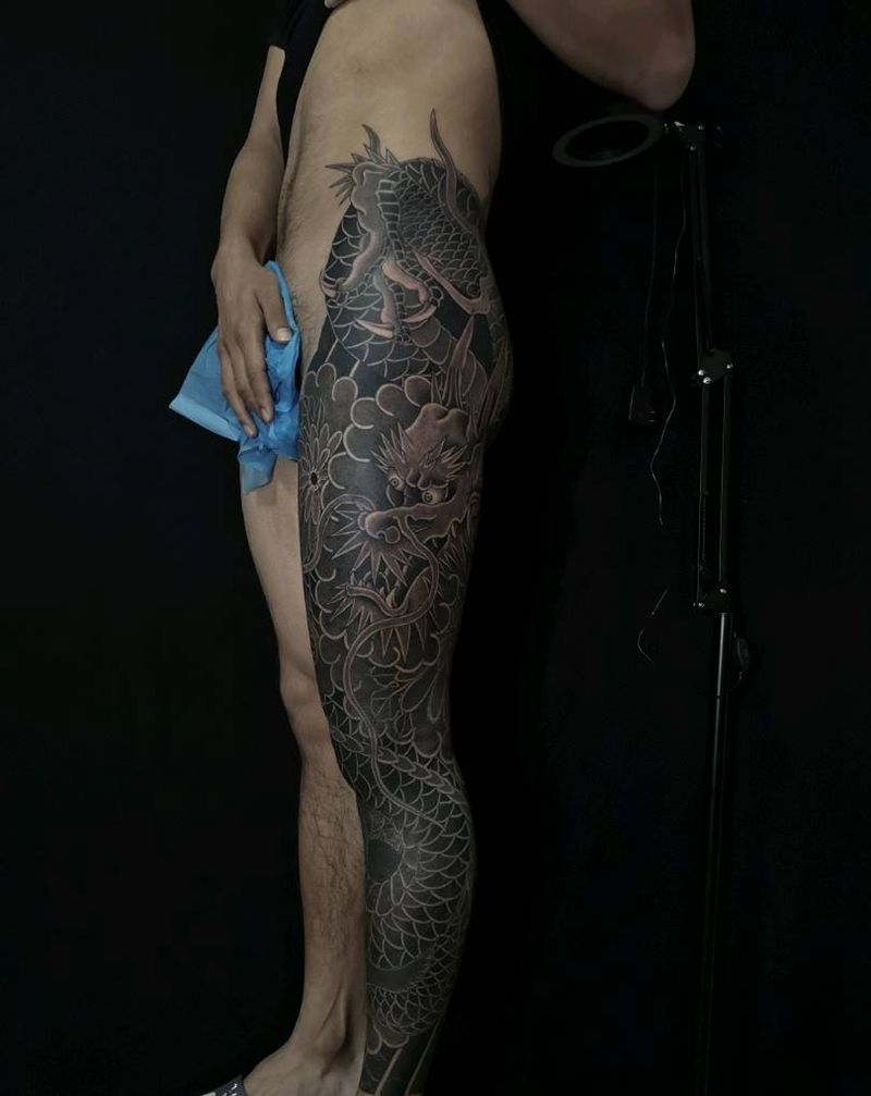 黑灰色传统花腿龙纹身图片_臀部腿部老传统新传统纹身图案
