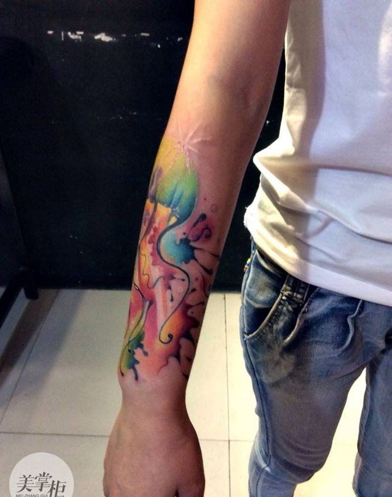 当前位置: 首页 >辽宁省葫芦岛市纹身店-二刚纹身纹身图案>涂鸦水母纹身图片_清新欧美动物手臂school纹身图案