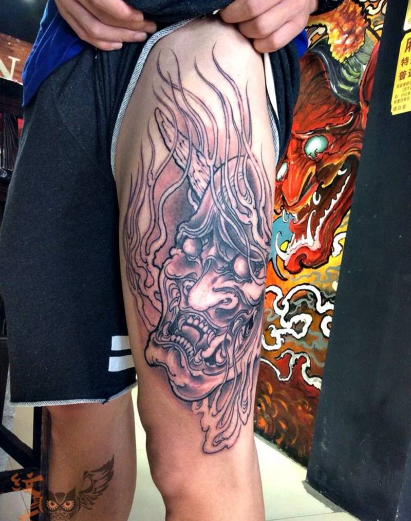 • T包小腿吹火男+阿多福纹身图片_腿部老传统新传统吹火男阿