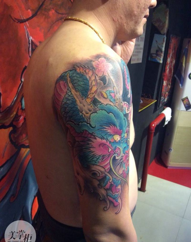 • T网红王老大花腿龙纹身图片_腿部新传统纹身图案