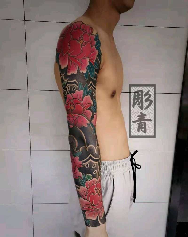 老传统牡丹花臂纹身图片_手臂手部老传统纹身图案