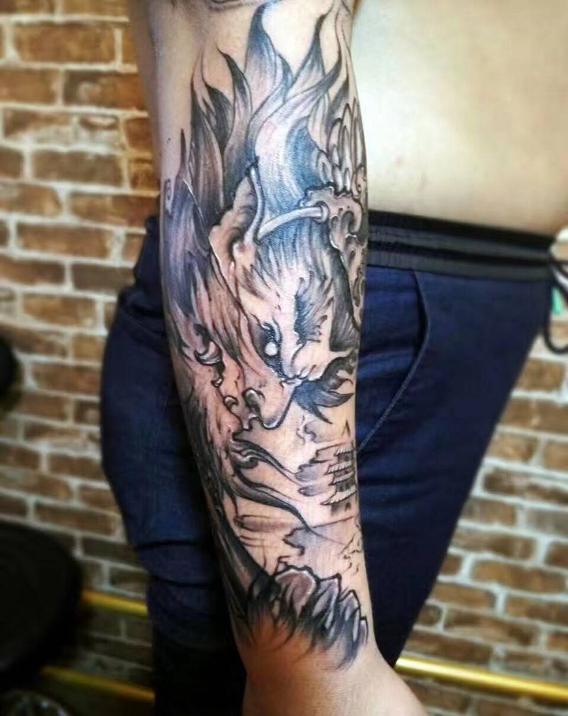 • T网红王老大花腿龙纹身图片_腿部新传统纹身图案