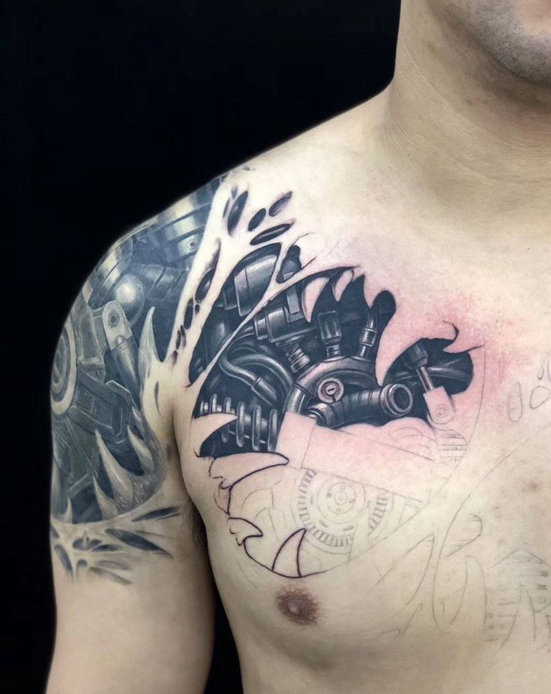 机械与心的缔造纹身图片_胸部欧美写实纹身图案
