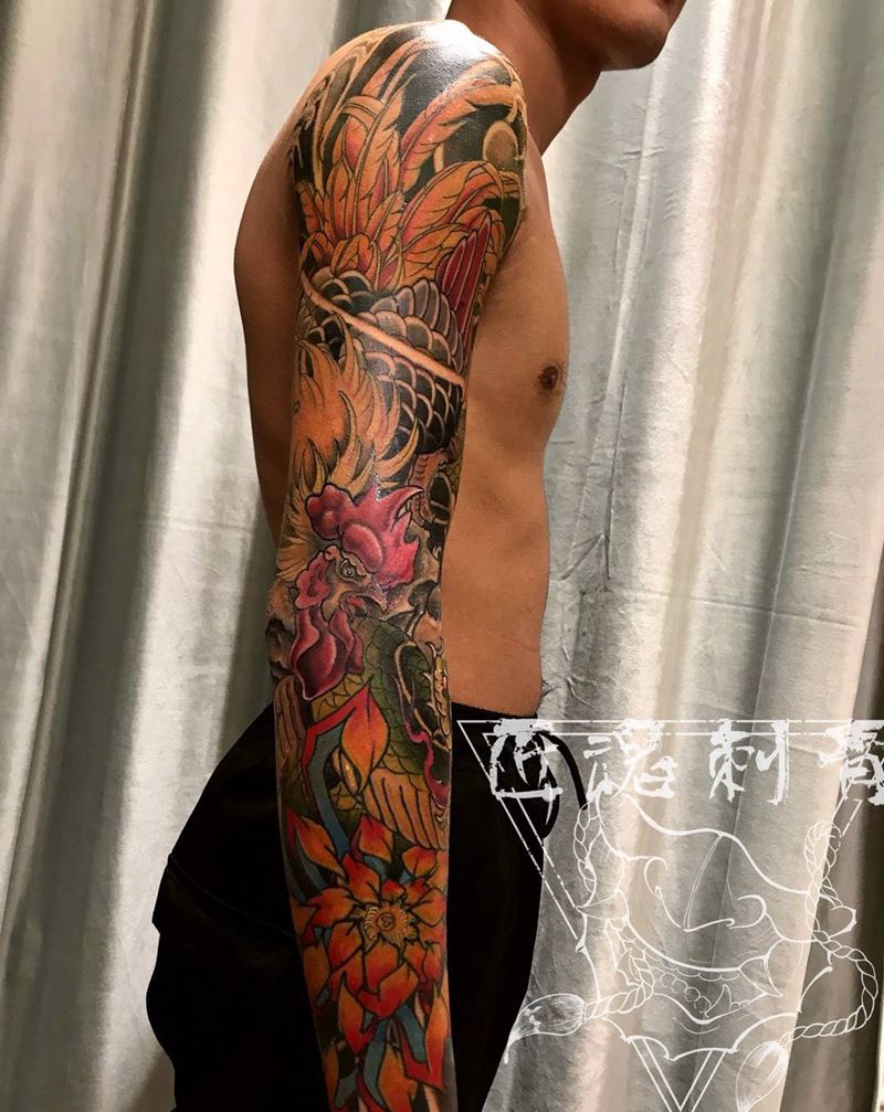 当前位置: 首页 >吉林省长春市纹身店-匠魂刺青纹身图案>金鸡戏蟒。纹身图片_手臂新传统纹身图案