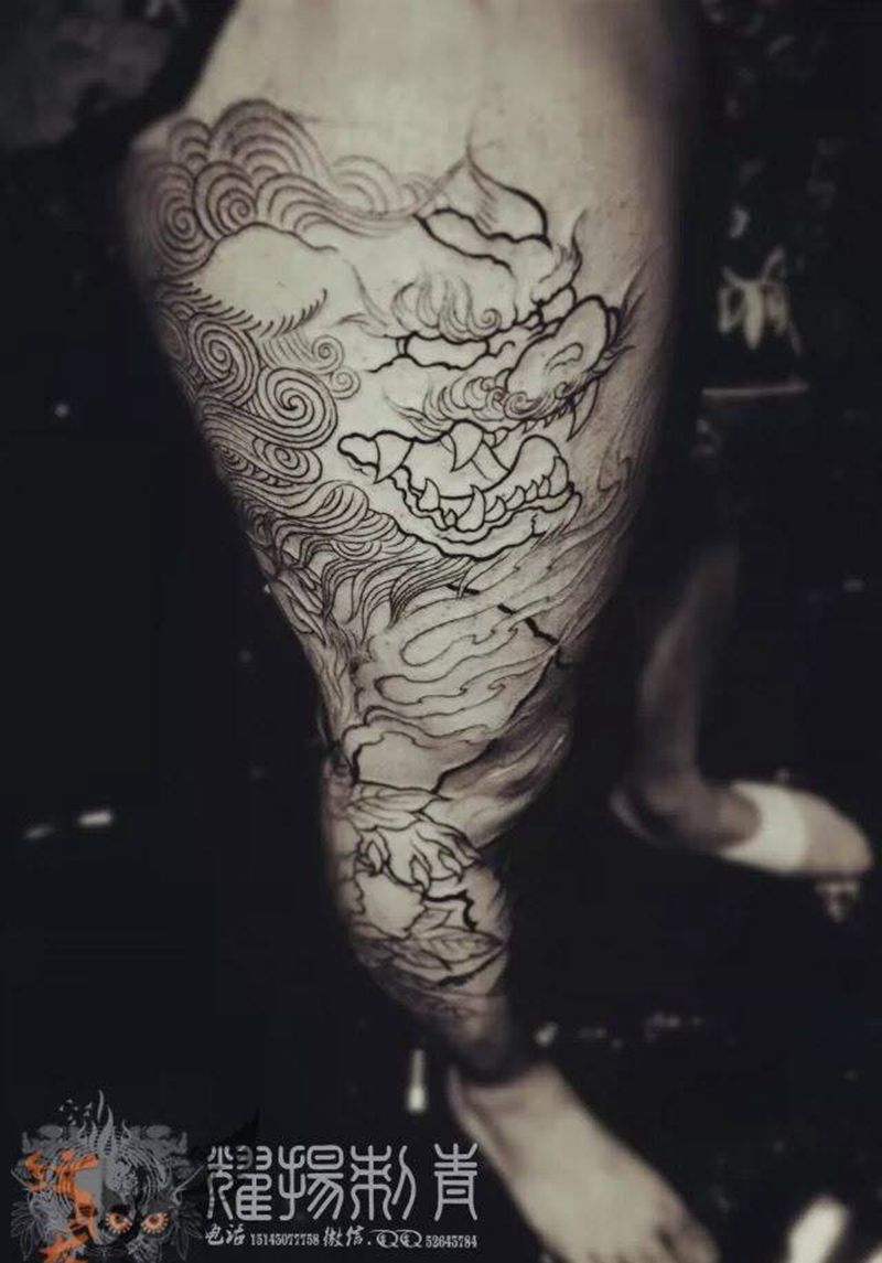 花腿唐狮纹身图片_传统动物原创植物鬼神臀部腿部脚部花腿纹身图案