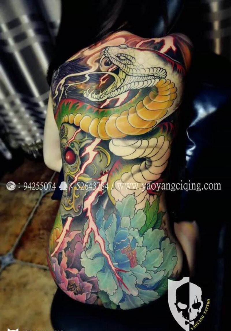 花蛇牡丹-耀扬刺青家族纹身图片_背部臀部腿部传统动物原创满背耀扬刺青鬼神植物纹身图案