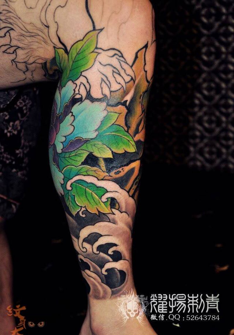 花腿 局部纹身图片_成品腿部传统国画习俗植物鬼神原创花腿纹身图案
