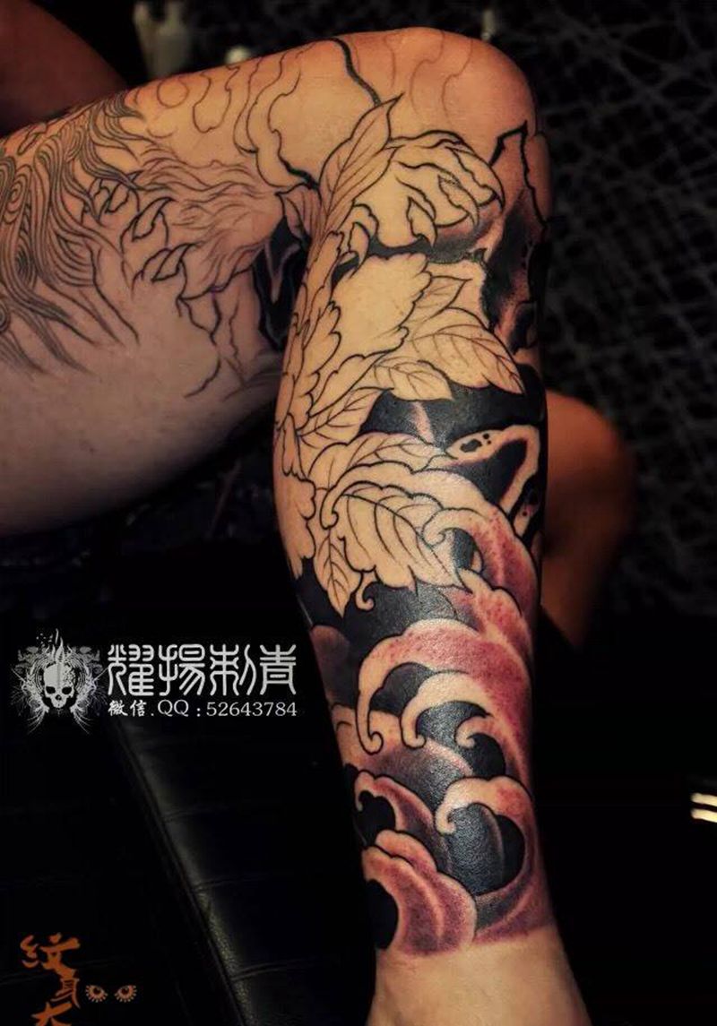 花腿唐狮纹身图片_成品腿部传统动物植物鬼神原创花腿纹身图案