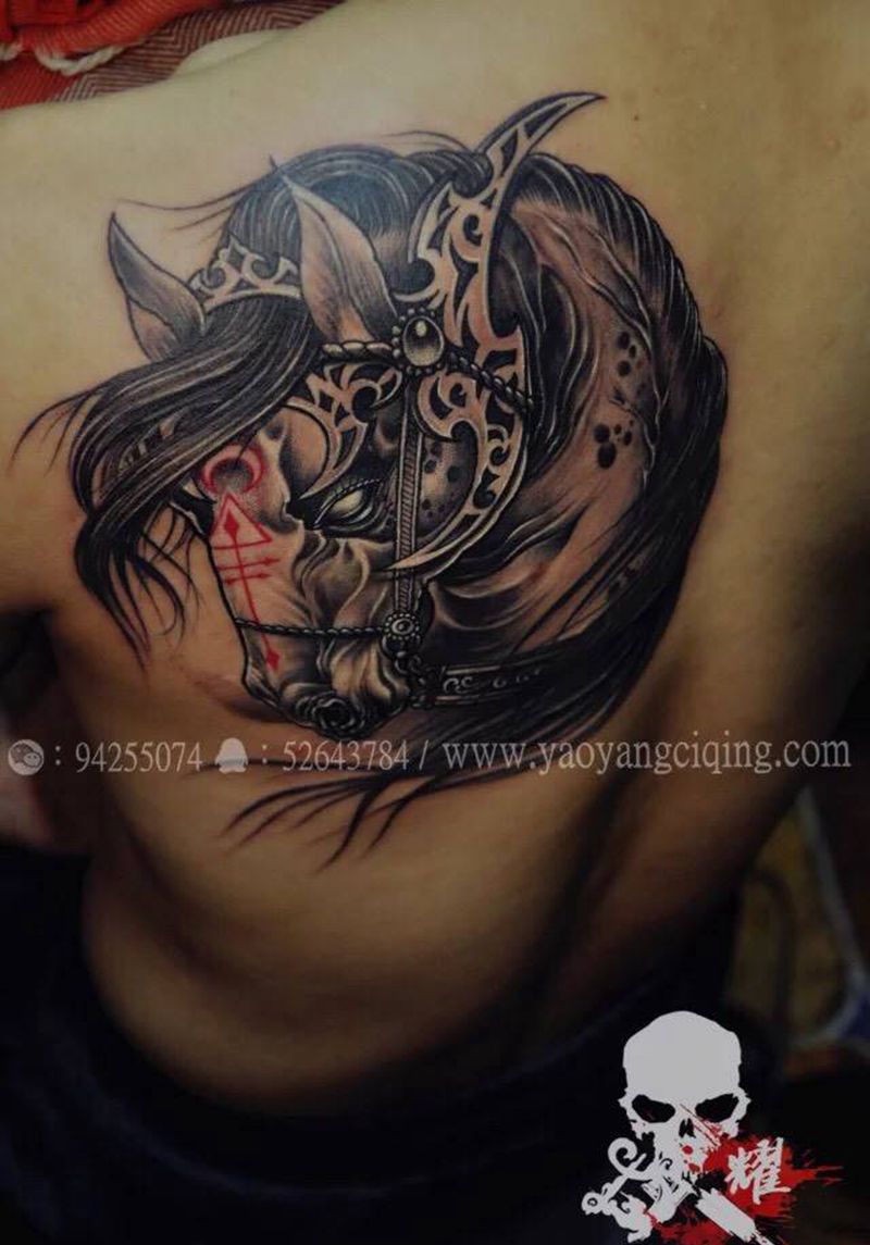当前位置: 首页 >吉林省长春市纹身店-耀扬刺青纹身图案>皇家战骑纹身图片_成品肩部背部传统欧美肖像写实动物原创耀扬刺青纹身图案