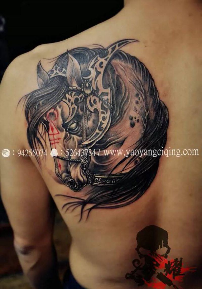 皇家战骑纹身图片_成品肩部背部传统欧美肖像写实动物原创耀扬刺青纹身图案