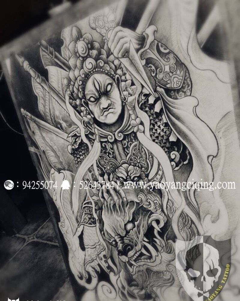 耀扬刺青家族 原创手稿纹身图片_手稿插画腿部背部传统肖像鬼神动物原创满背纹身图案