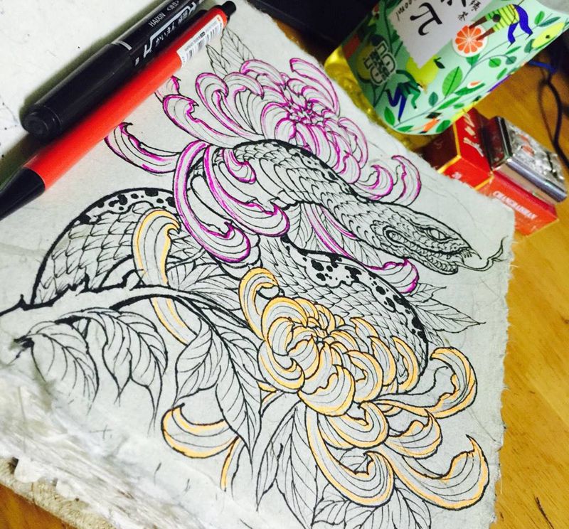 耀扬刺青手稿纹身图片_成品手稿插画传统清新国画动物植物原创生活纹身图案