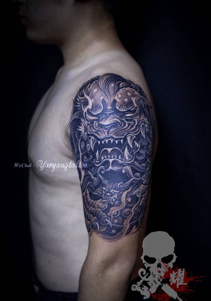 耀扬刺青 唐狮纹身图片_成品手臂传统肖像动物鬼神原创花臂生活耀扬刺青纹身图案