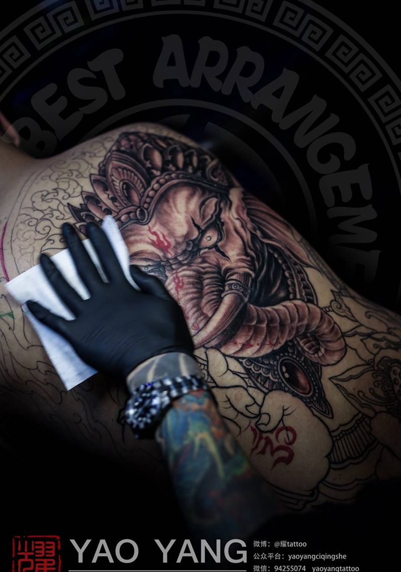 耀扬刺青 满背象神纹身图片_背部传统肖像动物人物鬼神原创宗教满背耀扬刺青纹身图案