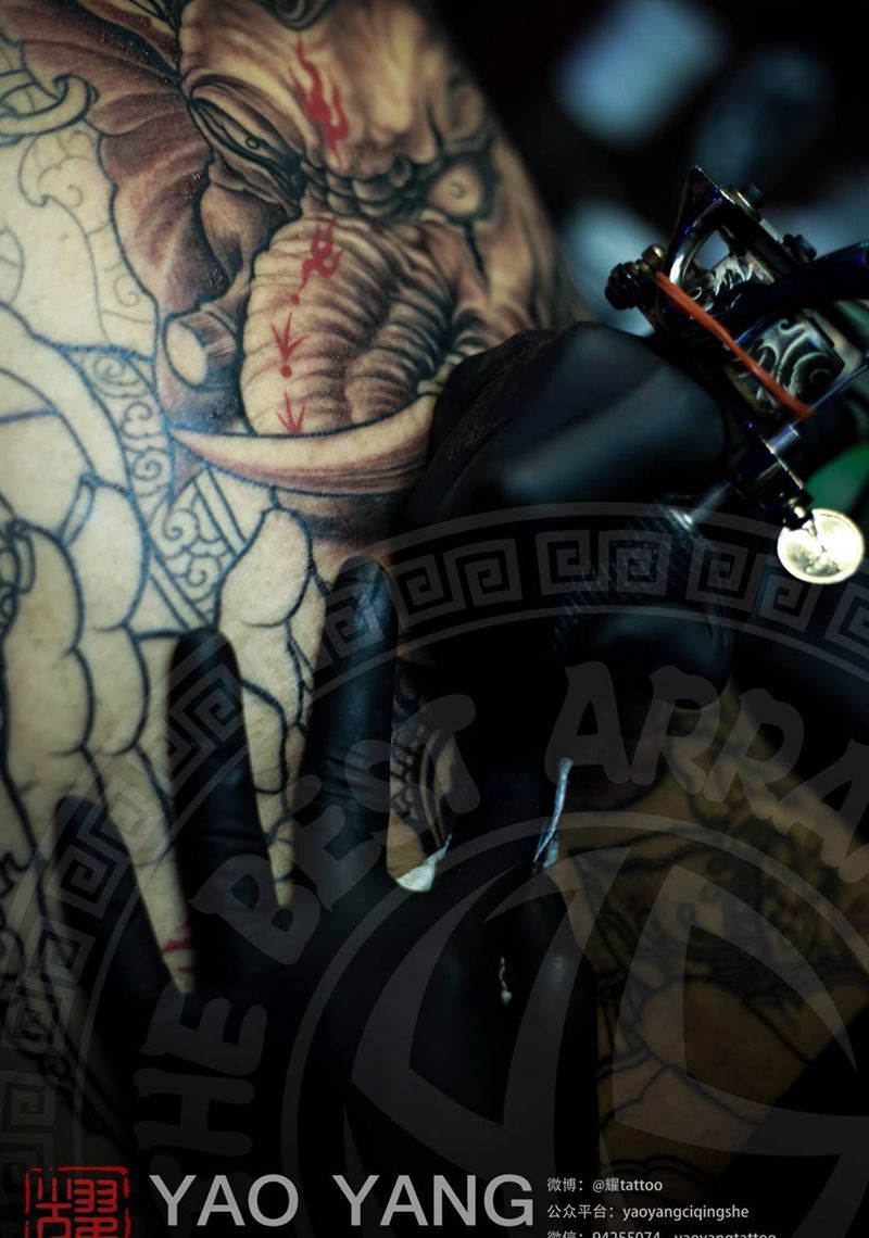 耀扬刺青 满背象神纹身图片_背部传统肖像动物人物鬼神原创宗教满背耀扬刺青纹身图案