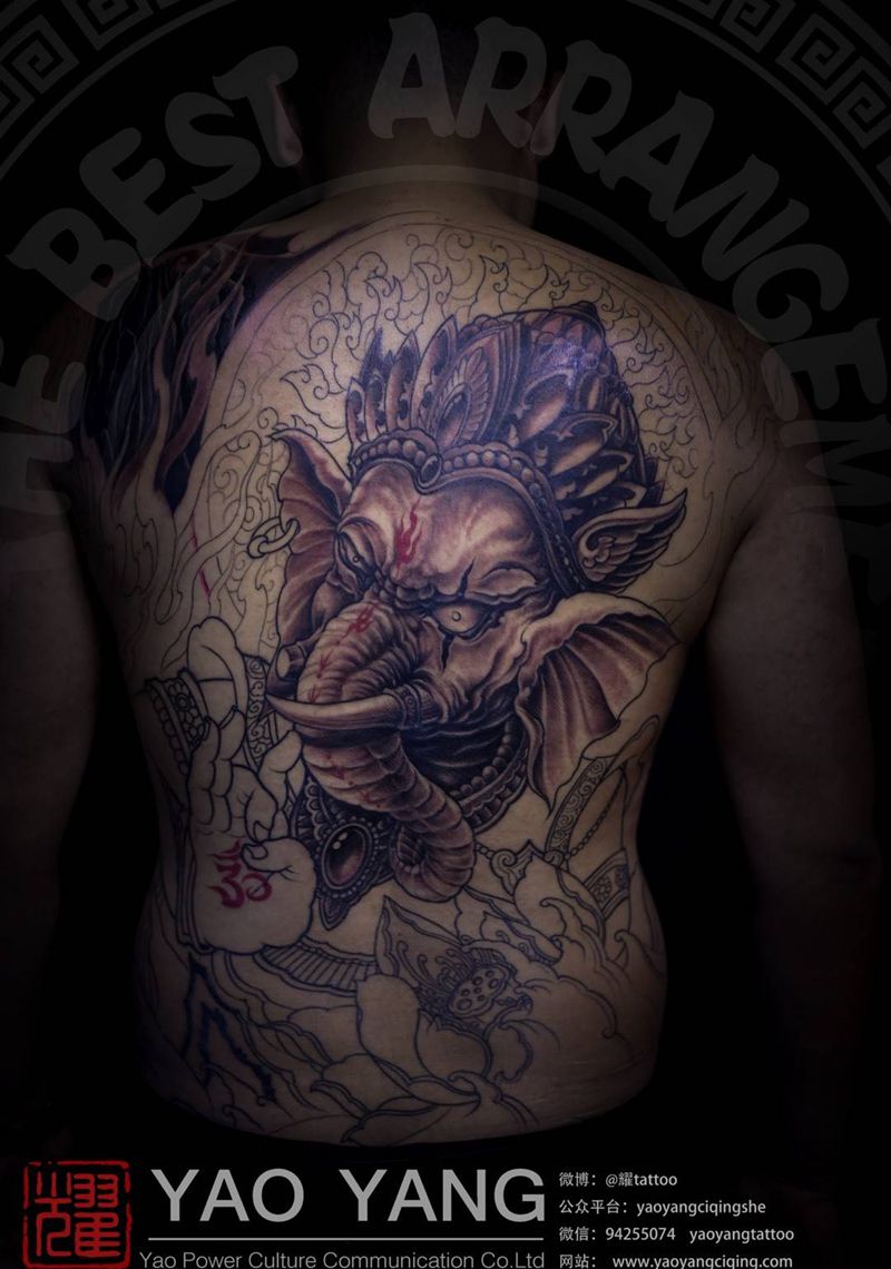 耀扬刺青 满背象神纹身图片_背部传统肖像动物人物鬼神原创宗教满背耀扬刺青纹身图案