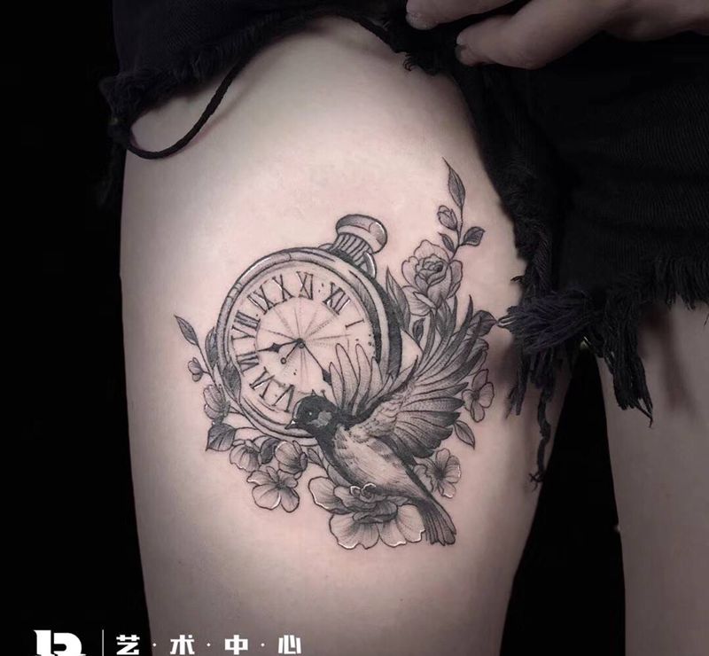 素花 鸟 怀表纹身图片_腿部纹身图案