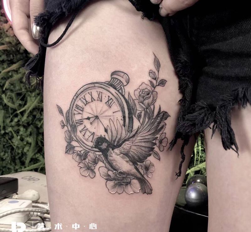 素花 鸟 怀表纹身图片_腿部纹身图案