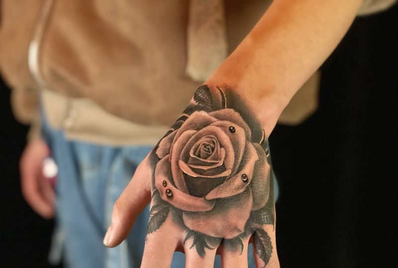 • 手背潮流时尚的玫瑰花眼睛纹身图案