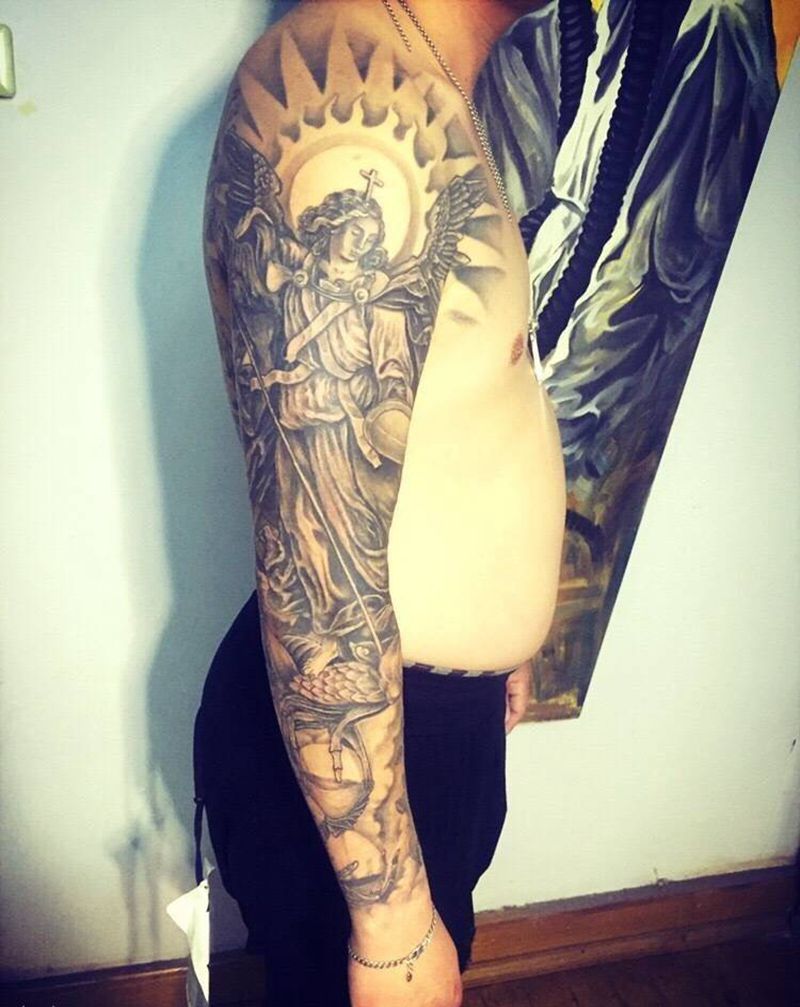 当前位置: 首页 >吉林省长春市纹身店-纹名堂刺青纹身图案>天使花臂纹身图片