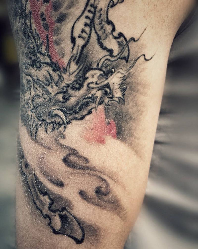 • T网红王老大花腿龙纹身图片_腿部新传统纹身图案