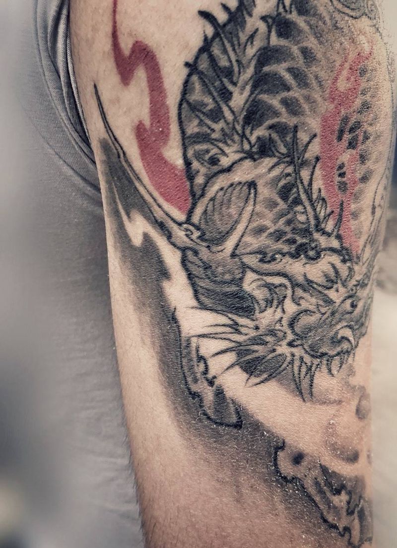 • T网红王老大花腿龙纹身图片_腿部新传统纹身图案