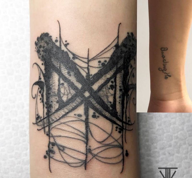 暗黑花体字遮盖纹身图片_手臂花体字纹身图案