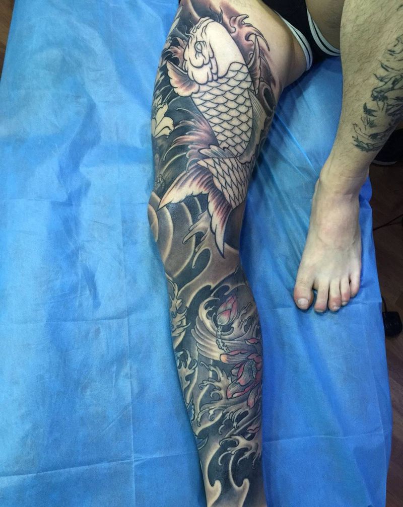 • T网红王老大花腿龙纹身图片_腿部新传统纹身图案