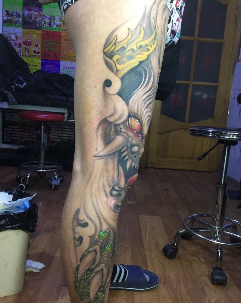 • T网红王老大花腿龙纹身图片_腿部新传统纹身图案