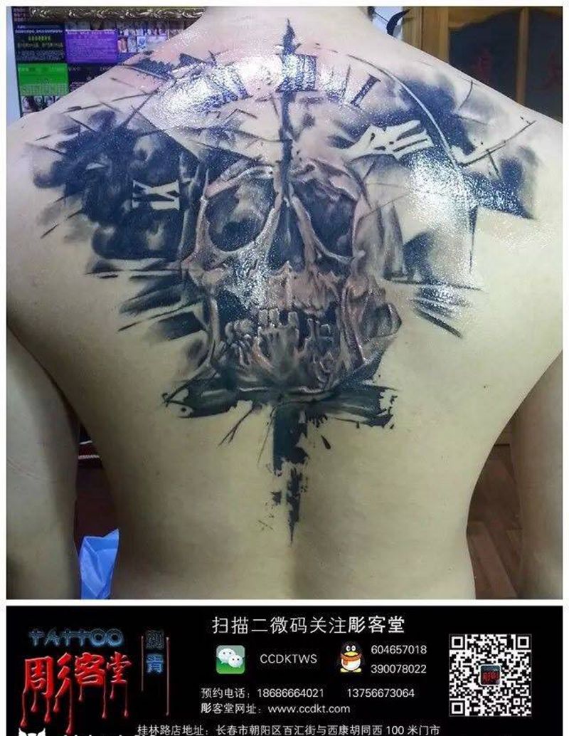 遮盖水墨骷髅纹身图片_成品背部传统欧美鬼神纹身图案