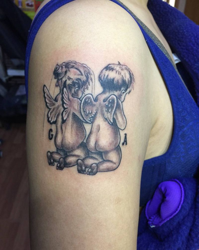 两个小天使纹身图片_成品肩部手臂清新人物纹身图案